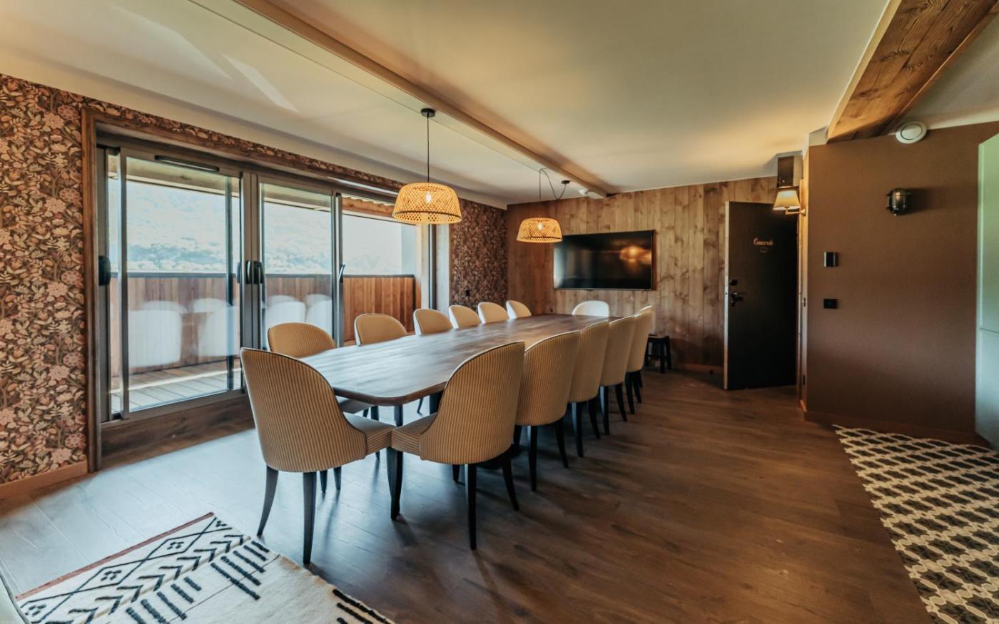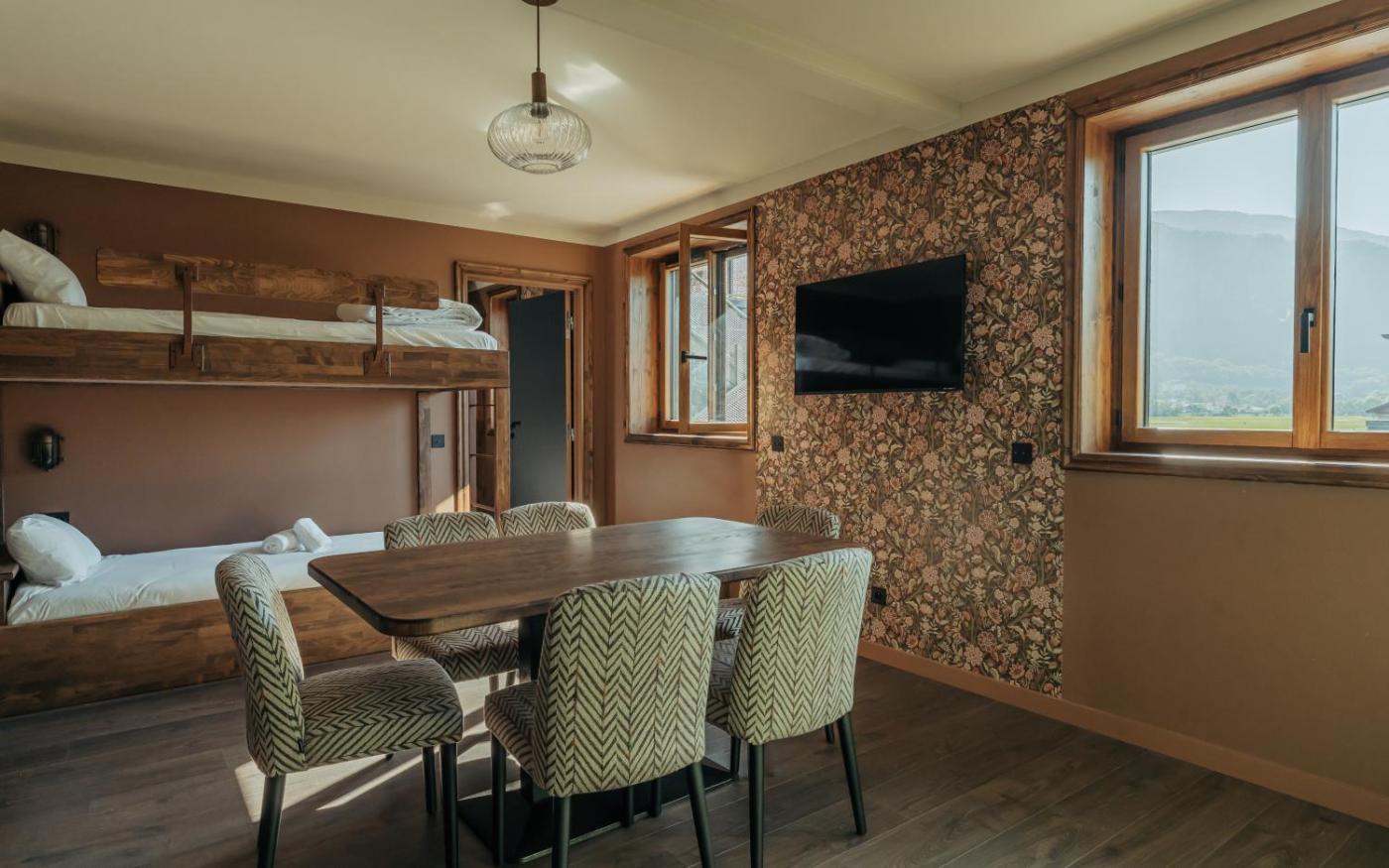 Chambre Quadruple - Vue sur Montagnes. The quadruple room offers air conditioning, a coffee machine, as well as a private bathroom featuring a shower and a hairdryer. The quadruple rooms kitchen, which features a stovetop and an oven, is available for cooking and storing food. The quadruple room provides a flat-screen TV, a dining area, a wardrobe, heating as well as mountain views. The unit offers 4 beds. ;