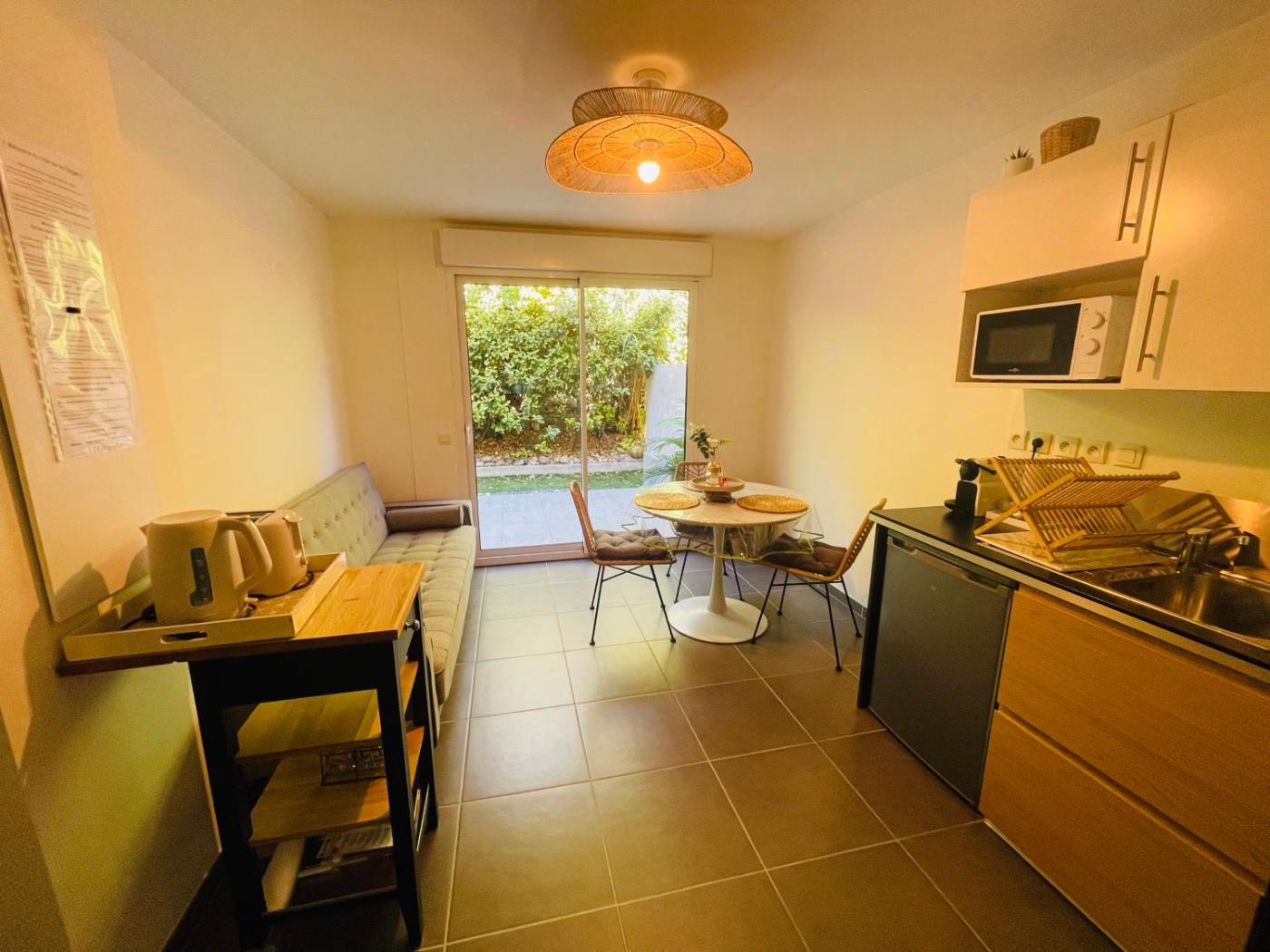 Cet appartement comporte 1 chambre, 1 salle de bains, du linge de lit, des serviettes, une télévision à écran plat, un coin repas, une kitchenette entièrement équipée et une terrasse offrant une vue sur le jardin.