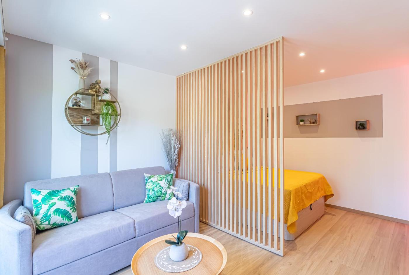 Appartement 1 Chambre. Cet appartement climatisé comprend un salon, une chambre séparée et une salle de bains pourvue d’une douche à litalienne. La cuisine bien équipée est munie de plaques de cuisson, d’un réfrigérateur, d’un lave-vaisselle et d’ustensiles. Offrant une vue sur le jardin, cet appartement dispose dun lave-linge, dune télévision à écran plat avec des services de streaming et de chocolats. Ce logement compte 2 lits.